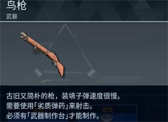 2、古旧又简朴的枪,装填子弹速度很慢,需要使用「劣质弹药|来射击,必须有【武器制作台】能制作。