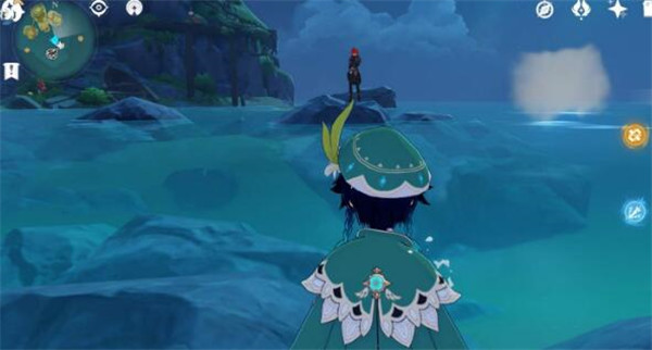 3、在右上方大家可以看到迪卢克就站在岸边的一块石头上。