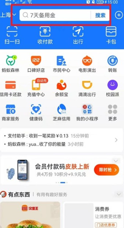 打开支付宝,然后我们点击上面的搜索框。