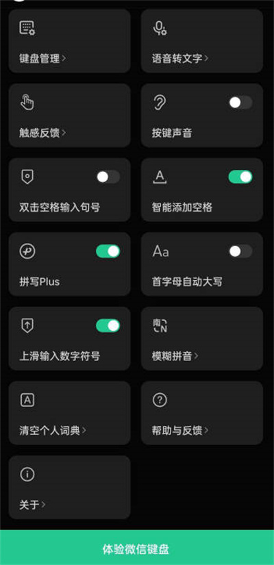 同时微信键盘中也是有很多其他的设置的,具体如上图所示,如果你获得了测试资格的话,你可以在这里设置语音转文字,触感,按键声音,双击空格输入句号,还有首字母自动大写等等的功能,总之目前正在内测中,等到正式上线之后应该是会发布的。