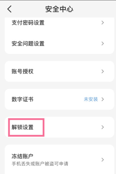 在安全中心的设置页面中,找到解锁设置的功能选项,点击并计入到解锁设置的功能页面中。