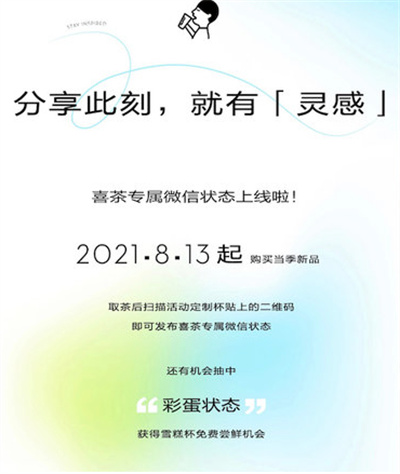 喜茶的微信专属状态上线啦,即日起购买喜茶,扫描杯上的二维码就可以在微信设置状态啦,有多种状态可以设置,还有机会抽中”彩蛋状态“哦,一起来看看如何设置吧。