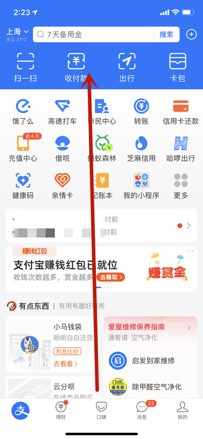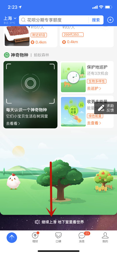 打开支付宝,在首页中一直向上滑动。
