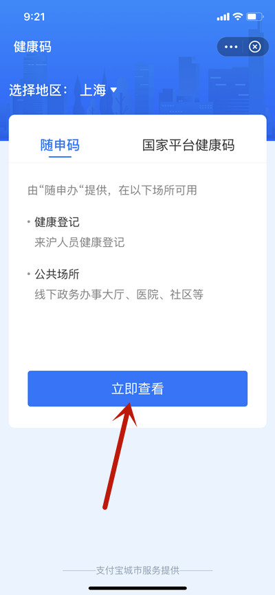 打开支付宝软件,搜索健康码,然后点击进入当地的健康码,点击立即查看。