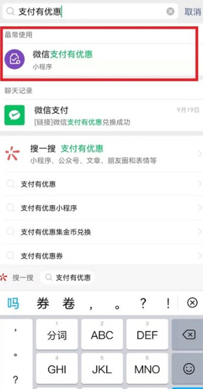 打开微信,然后我们在上面搜索微信支付有优惠,并点击第一个。