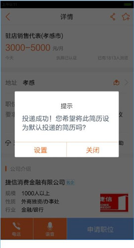 四、进入那个公司的招聘页面后点击职位即可显示投递成功界面。