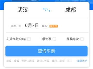 第一步、首先打开软件,然后选择出发的地点和详细的出行时间,再点击 “查询车票” 。