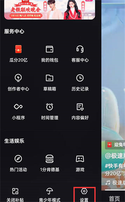 我们进入快手的菜单页面之后,然后我们点击下面的设置功能。