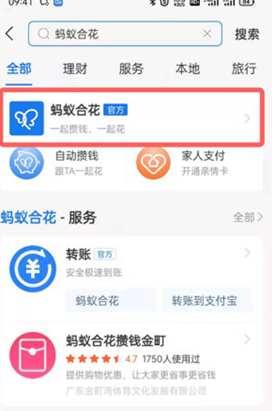 搜索关键词打开支付宝,在上面的搜索框中搜索蚂蚁合花选项。