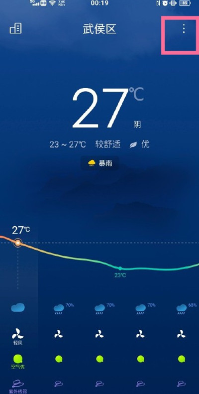 点击三个点打开手机中的天气,然后点击右上角的三个点选项。