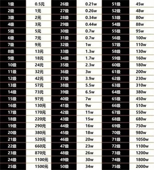 1级=0.1元;2级=0.7元;3级=1.6元;4级=2.9元;5级=4.5元;6级=6.6元;7级=9元;8级=13.2元;9级=17.5元;10级=24.3元。