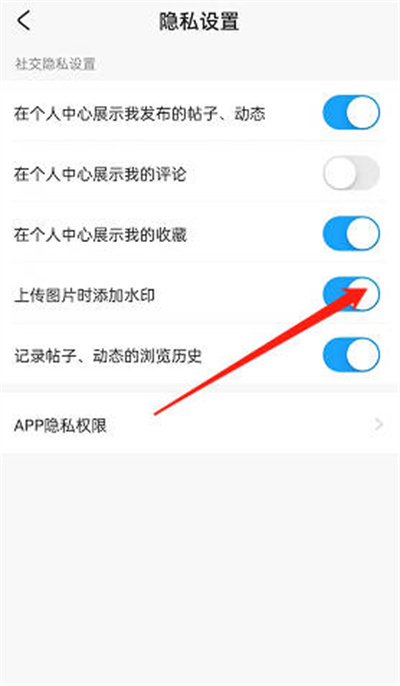 进入隐私设置之后,我们可以找到上传图片时添加水印的功能,点击右侧的滑块开启即可。