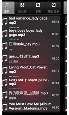 拥有多种选择方式,例如艺术家,专辑,音乐,最近播放等,也可以显示歌词,