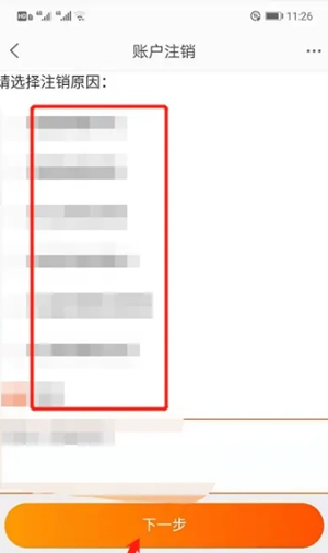 3、最后选择一个注销的原因,点击‘下一步’,即可根据提示完成相应内容。最后一个是‘其他’如果勾选了,一定要在文本框里协商注销的理由,否则不能通过。