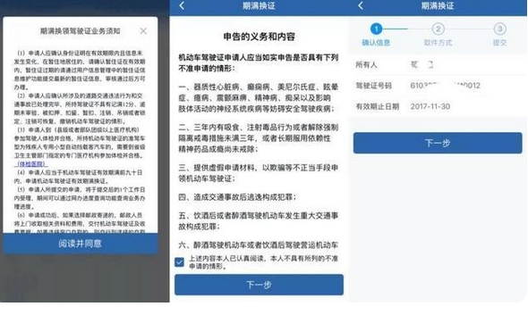 首先,用心浏览期满换证业务须知后,您能够点一下【浏览并同意】,确定用户申告内容,进到驾驶人信息确定界面,确定信息包含姓名、驾驶证号码、有效期止日期等。