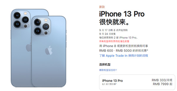购买时间在苹果官网中我们可以看到,新系列的手机iphone13系列将会在17号开放预购,每个人还会限制购买的数量,在官网中我们可以看到具体的购买价格等等,也可以在实体店中预订,但是在官网开售前实体店是拿不到机器的,所以要等到17号开放预售之后我们才能去预订。
