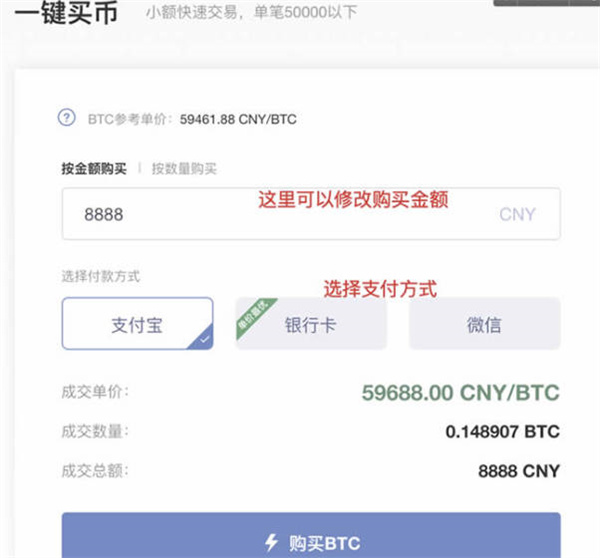 2:接着填写我们想要的数额还有币种,点击一键购买,然后进入到订单的确认页面中,确定好订单之后点击购买ETH,进入下一个订单支付页面。