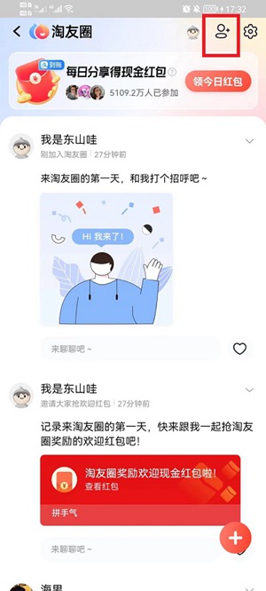 2、在淘友圈中,点击右上角的【中间图标】进入到其中;