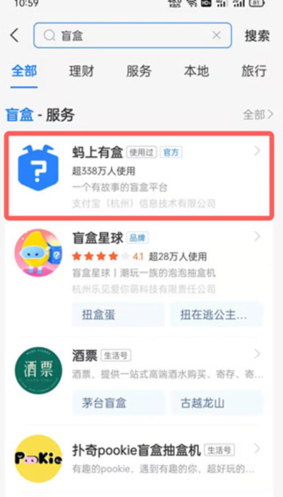 点击蚂上有盒打开支付宝,然后在首页点击搜索框,在搜索框中输入盲盒,点击第一个蚂上有盒。