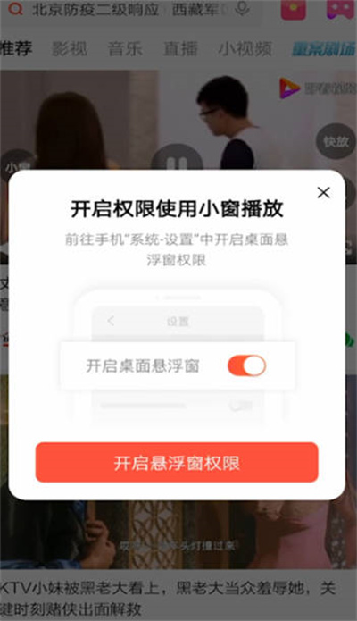 当你点击了之后,如果你已经默认使用此权限那么就会直接变成小窗,如果你没有开启的话,会弹出下面的对话框,点击下面的开启悬浮窗权限。
